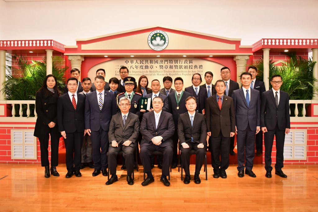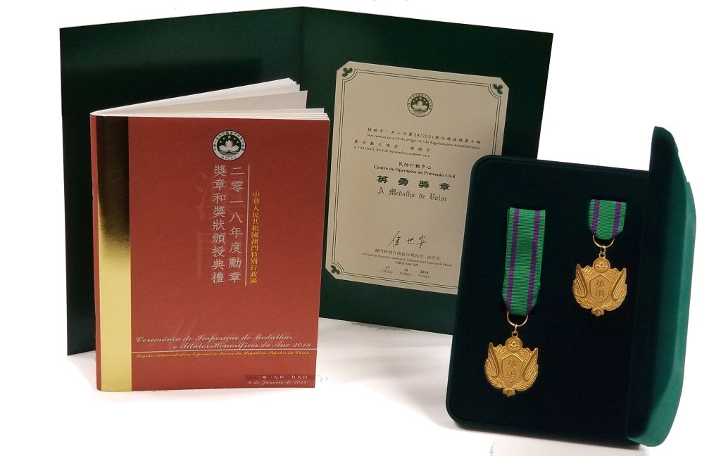 本月(9日)下午四時正,澳門特區政府於文化中心綜合劇院舉行「澳門特別行政區2018年度授勳儀式」,以表揚在個人成就、社會貢獻或服務澳門特別行政區方面有傑出表現的人士或實體,警察總局民防行動中心榮獲特區政府頒授英勇獎章。